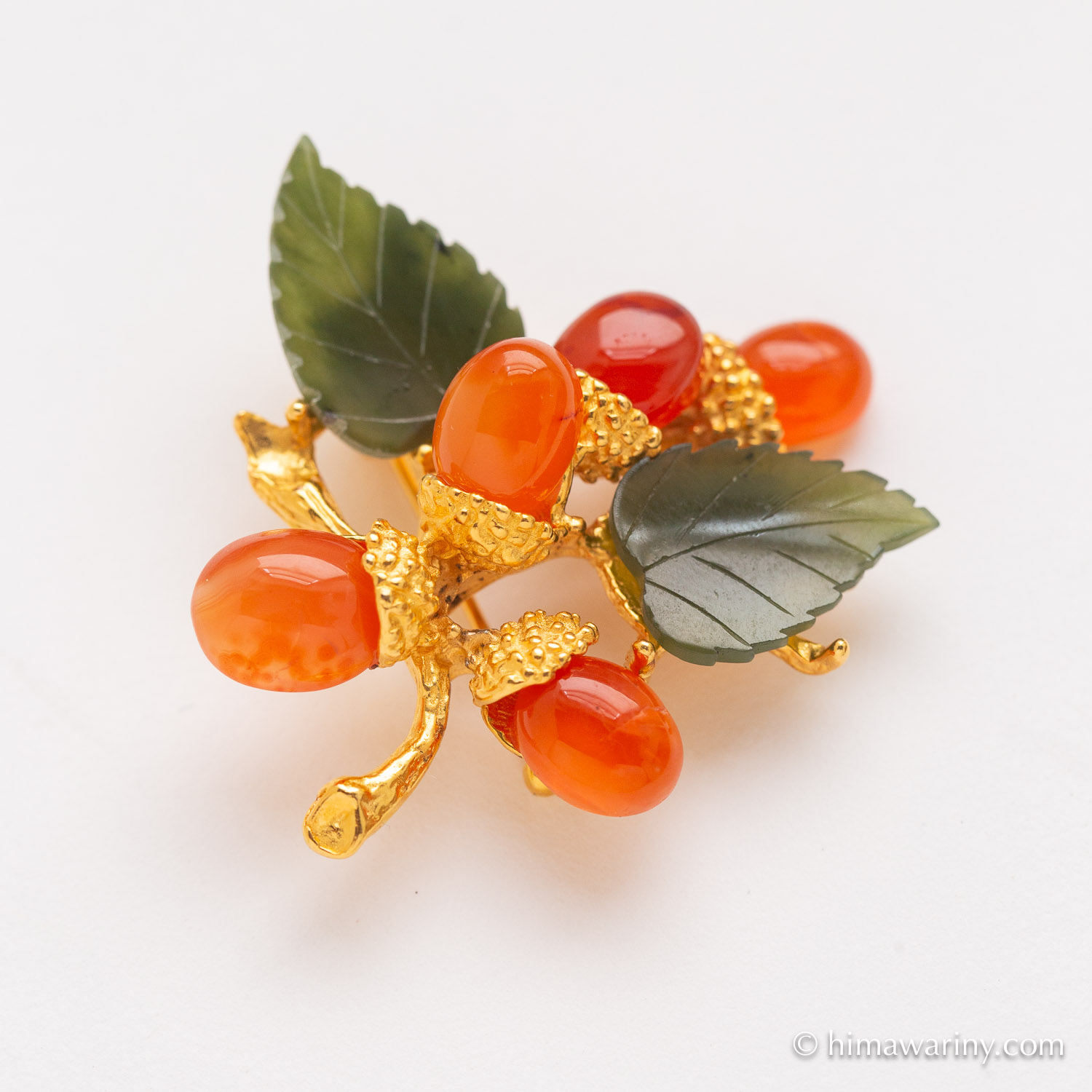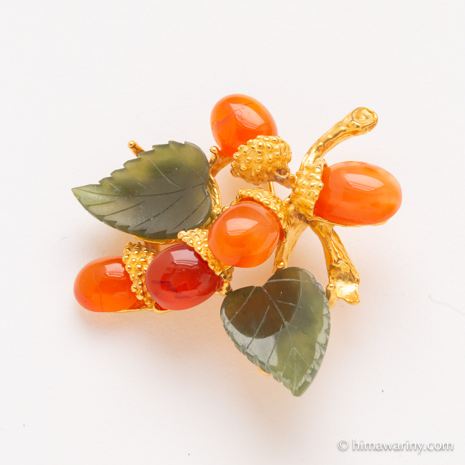 天然石カボションならではの魅力がいっぱい!翡翠の葉っぱには手彫りエングレービングの葉脈、一粒一粒の色味、景色が違う瑞々しいカーネリアンのドングリの実が大人かわいいヴィンテージ・ブローチ。