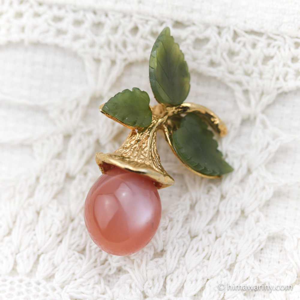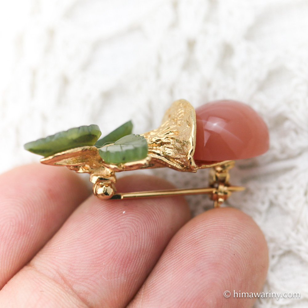 翡翠の葉が3枚ついた小枝、ディティールによるゴールドの陰影が美しい萼、その先にはみずみずしいローズの蕾が。光の入り方によって移ろいゆく輝きが神秘的なムーンストーンに見惚れるSwoboda スワボダ/スウォボダ製ヴィンテージ・ブローチ。