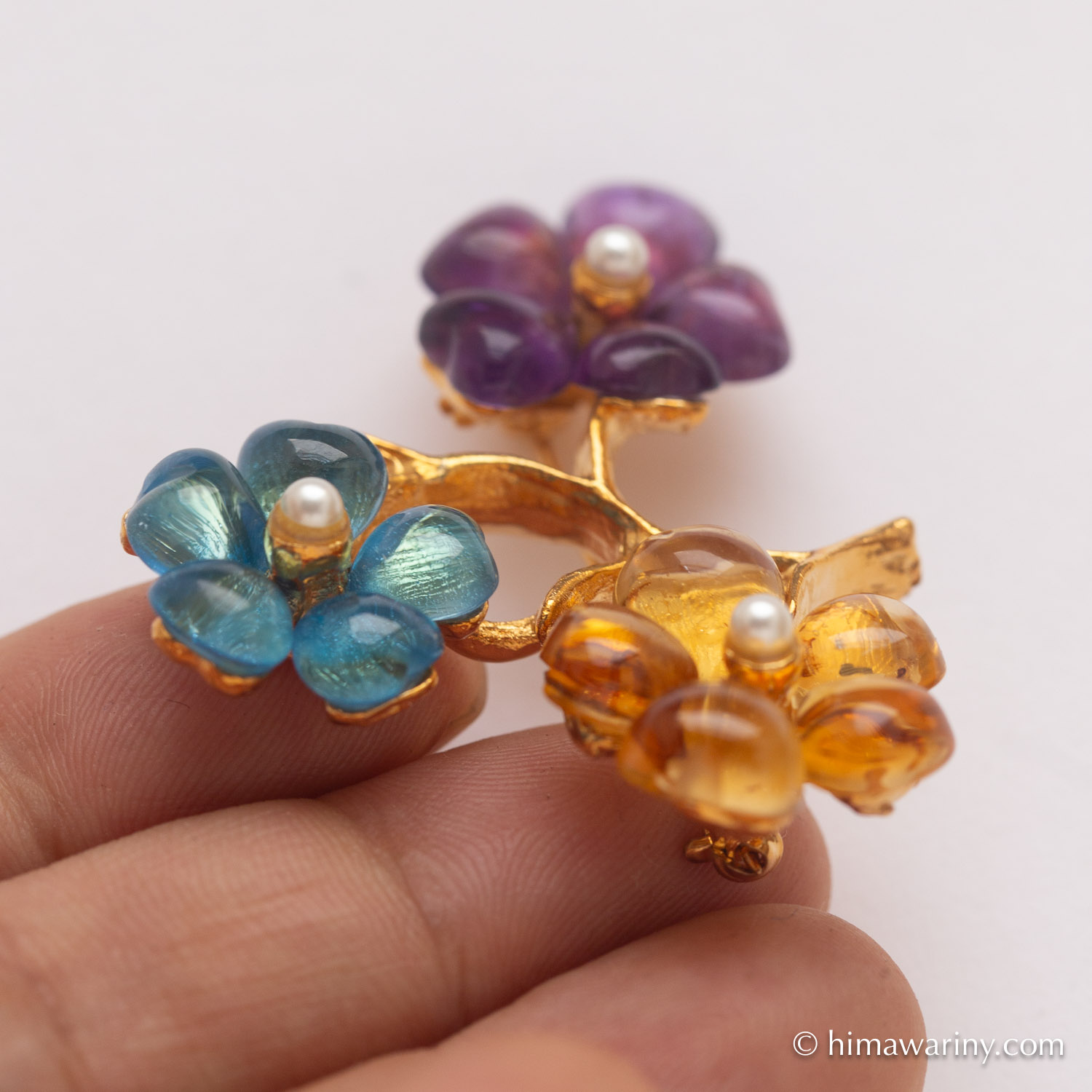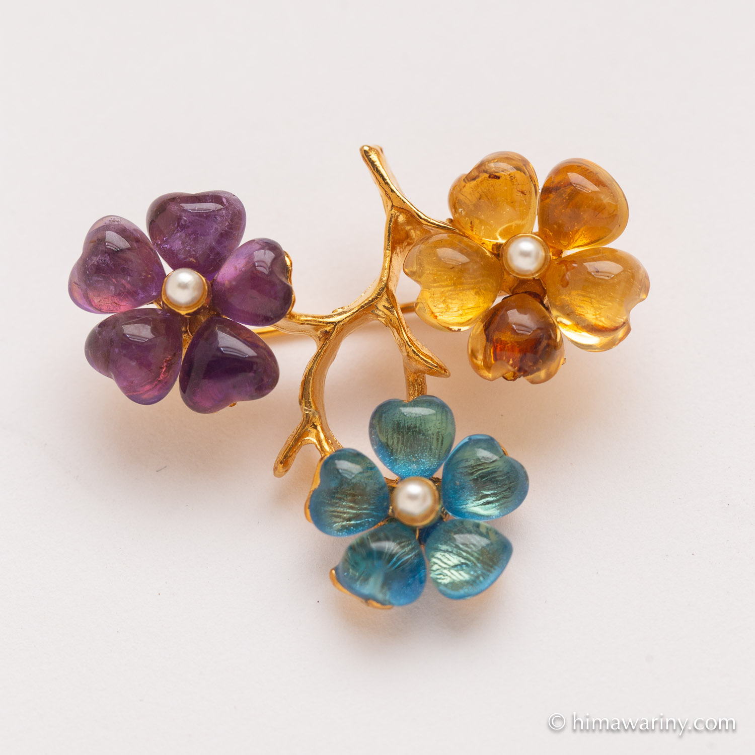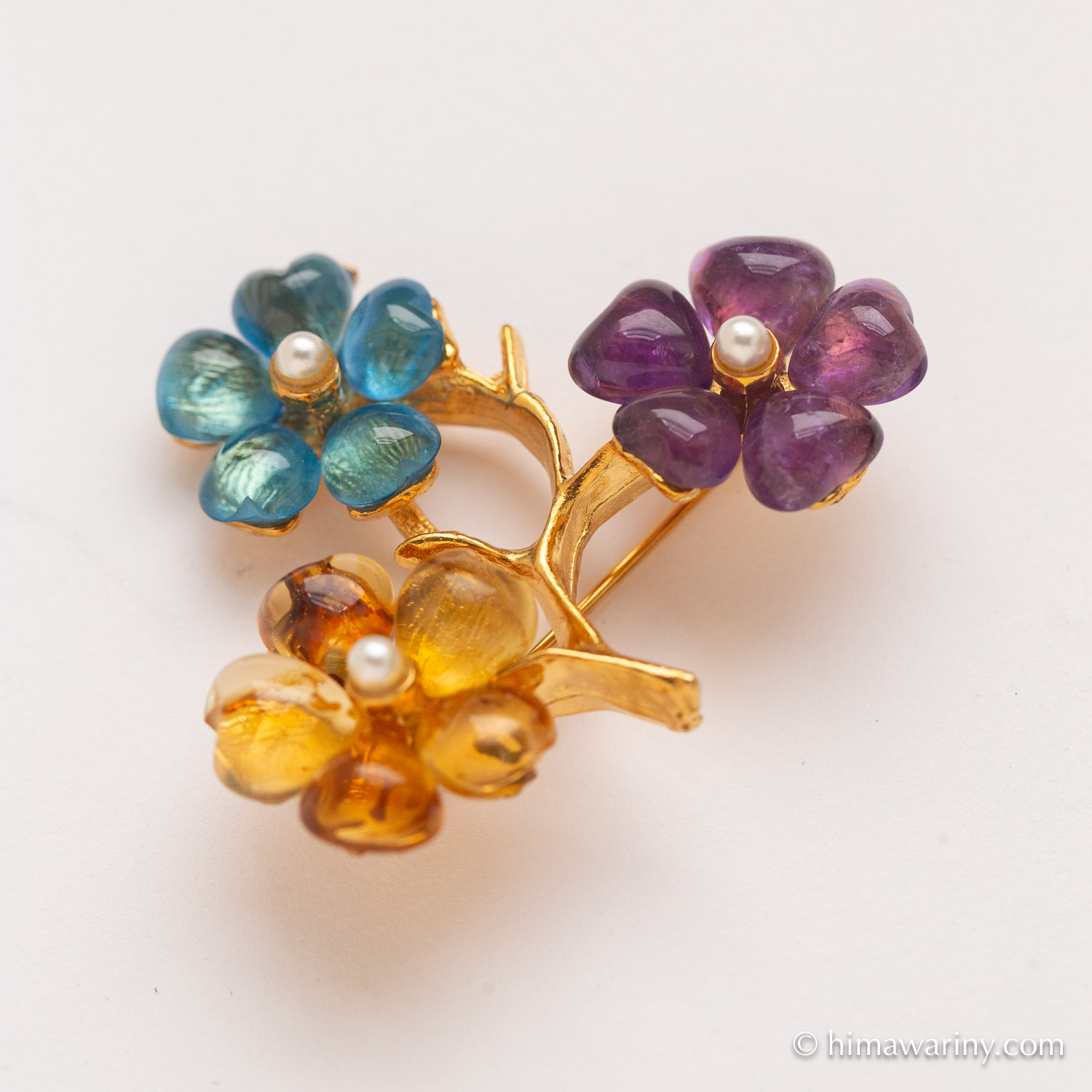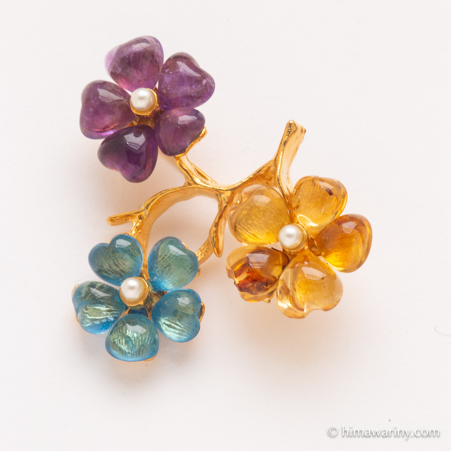 ぷっくり、艶々ハートの花びらがかわいい!アメジスト、シトリン、ブルートパーズ、それぞれ中央に小さな真珠があしらわれたかわいい3つの花の小枝のヴィンテージ・ブローチ。