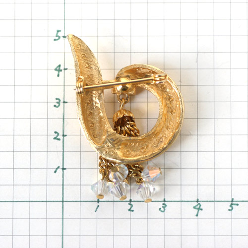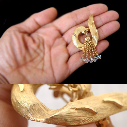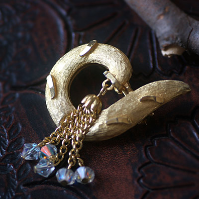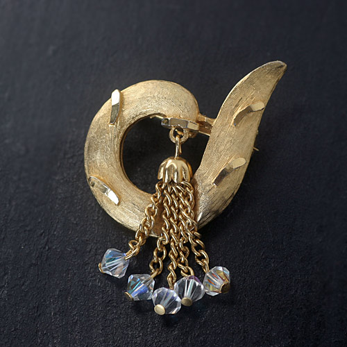 渦巻きっぽいシェープのモチーフから、タッセルがぶらさがったモダンなデザインのヴィンテージ・ブローチ。