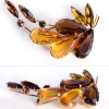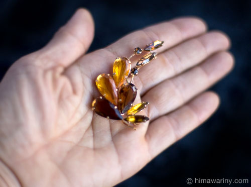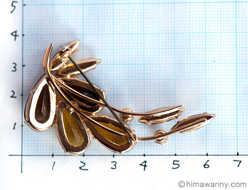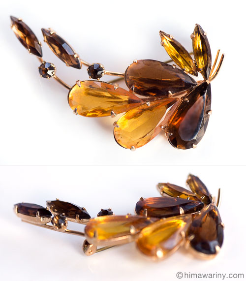琥珀系のブラウンとイエロー・オレンジの色でコーディネートされたガラスの美しさが散りばめられた大人テーストのヴィンテージ・ブローチ。弧を描いたアシンメトリーなデザインのバランスも美しく、オープンバックの大粒のティアドロップシェイプのファセットカットガラス、スレンダーで鋭角なマーキースシェイプのラインストーン、そしてラウンドシェイプの小さなラインストーンなど、随所にD&E Juliana ジュリアナの特徴が見られるお品です。