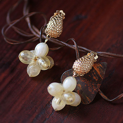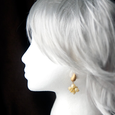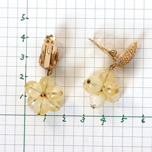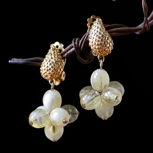 ミルク入りレモンキャンディのようなルーサイトのビーズがゆらゆら揺れるダングリング・タイプのヴィンテージ・イヤリング。クリップの部分は、勾玉っぽいアシンメトリーなシェープのティアドロップで、ぷっくり立体的で、ディティールに表情があるのがお洒落です。