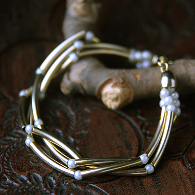 カーブしたチューブメタル・パーツとちっちゃなパールが交互にリンクしたラインが三連、美しく寄り添いながらなめらかな曲線をなしたヴィンテージ・ブレスレット。