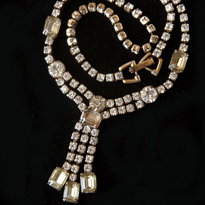 総爪留めのラインストーンが美しいアンティーク・チョーカータイプ・ネックレス。小さめ約3mm径のラインストーンが連なる繊細なネックラインに、胸元に添いながらしなる三筋のセンターパーツがとても洒落たデザインのお品です。
