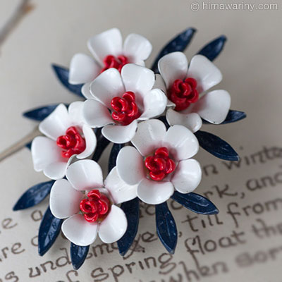 ダークなネイビーブルーの葉っぱ、白い花びらに赤い花心。シックなトリコロール調がかわいいヴィンテージ・フラワー・ブローチ。