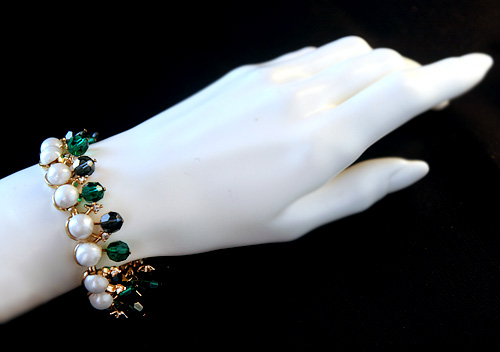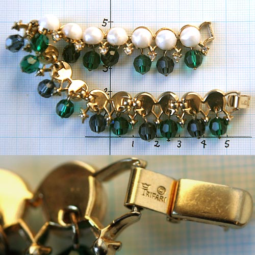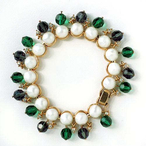 エメラルドグリーンとサファイヤブルーのファセットカット・ビーズが交互に並び、手首のまわりでゆらゆら揺れるゴージャス・エレガントなTrifari トリファリのヴィンテージ・ブレスレット。
