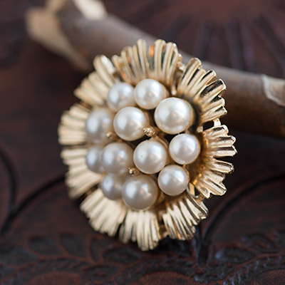 大中小、微妙に大きさが違うパールがこんもりびっしり。その輝きを映して増幅するかのようにゴールドの花びらが艶やかに、のびやかに輝いているヴィンテージ・ブローチ。太陽の花のイメージがぴったり!ゴージャスで晴れやかなエネルギーを感じます。
