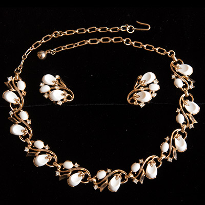 くぼみのあるティアドロップシェイプのカボションと、小さなオーバルカボションで構成された植物モチーフがリンクしたチョーカータイプのヴィンテージ・ネックレスと、お揃いのクリップ式イヤリングのセット・ジュエリーです。