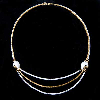 ホワイトとゴールド、ベーシックな二色使いのチェーンが爽やかなヴィンテージ・ネックレス。2つの半球ドーム型のパーツで、二連のチェーンと三連のチェーンに分かれているユニークなデザイン。アメリカのコスチュームジュエリー・ブランド、Crown Trifari クラウントリファリのお品です。