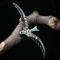 ちょうどまさに今、小枝に舞い降りた小鳥が森の魔法でジュエルになったかのような本物の鳥の存在感が見事です。いつか魔法が解けて、また飛び立っていきそうな、命が感じられるお品です。