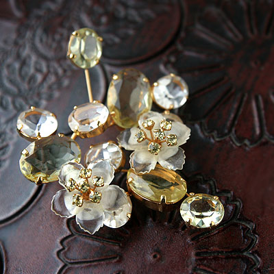 クリスタルクリアと淡い檸檬イエローのコンビが秋の日差しのように輝くヴィンテージ・フラワー・ブローチ。樹脂製の花びらの中央がフロストガラスのようになっていて、雄しべにはプロングセット(爪留め)のラインストーンが揺れるとても清楚で華やかなお品です。