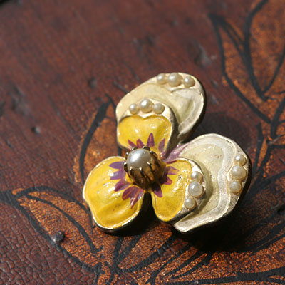心に花を。気持ちを明るくしてくれるラッキーカラー、黄色いパンジーのちっちゃなアンティーク・ブローチ。花びらはハンドペイントでクリームベージュ、山吹色、パープルで重ね塗りされています。