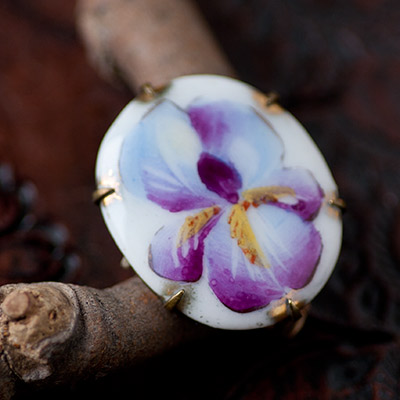 やさしいブルーからパープルの色合いで、オーキッド、あるいはスミレの花が白い陶磁の上に描かれたアンティーク・ブローチ。プロングセット(爪留め)されているところには、ゴールドのペイントがあしらわれています。