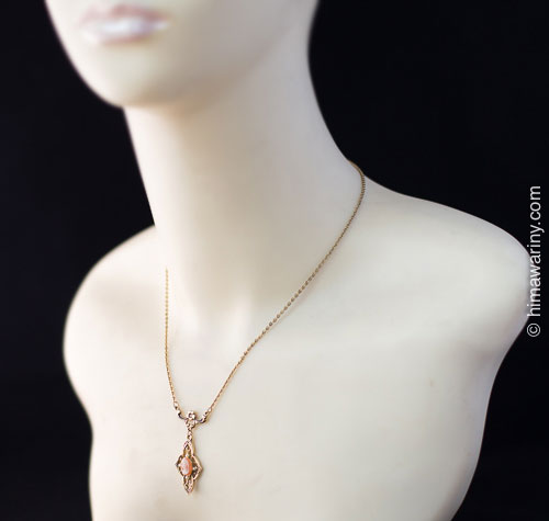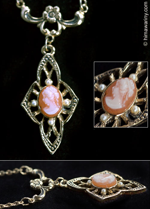ダイヤシェイプのフィリグリーパーツの中央に、横顔が美しい貴婦人のカメオ、そして周囲にはちっちゃなシードパール。花があしらわれた繊細なデザインのパーツがポイントになった素敵なヴィンテージ・ペンダント・ネックレスです。