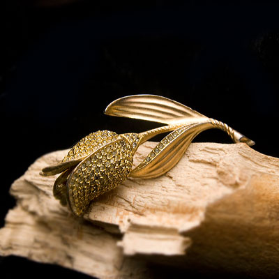 ともするとキュートになりがちなチューリップ・デザインのフラワーモチーフですが、持つと重量感があり、花びらの内側にエングレービング(彫り)がほどこされたアーティスティックなクラフトとヴィンテージならではの金古美色とラインストーンの輝きで落ち着いた大人っぽい雰囲気のブローチになっています。