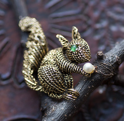 森のいたずらっ子、リスのキュートなヴィンテージ・ブローチ。アンティークゴールドカラーの縄目のテクスチャーで、立体的に表現された造形が、ハンドクラフトのような温かさを醸し出しています。