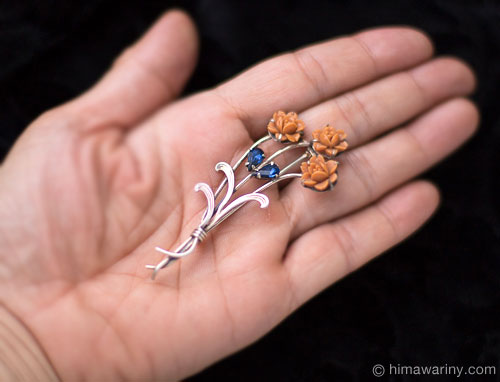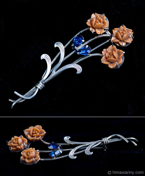 三本の薔薇の花を束ねたアールデコ調デザインのアンティーク・ブローチ。時の深さを感じさせるアンティーク・シルバーの渋い輝きと、なんとも形容し難いシックなブラウンピンク系の柿色のフラワー・カボション、ティアドロップ・シェイプのサファイヤブルー・ラインストーンの組み合わせ。現代ものジュエリーには出せない美しい佇まいを見せています。