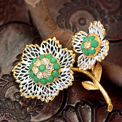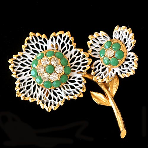 ミルキーなエメラルドグリーンとクリアなラインストーンがドーム状の花心に据えられた白いレースのようなフィリグリーのヴィンテージ・フラワー・ブローチ。
