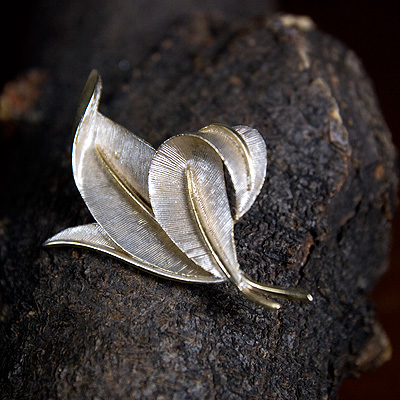 3枚の葉が重なったデザインのヴィンテージ・ブローチ。葉の表面には、細かなエングレービングが施されていて、少し地色のゴールドが透けて見えているようなうっすらと光沢のあるホワイトカラーがとてもきれいで、シンプルですがオリジナリティのあるお品です。
