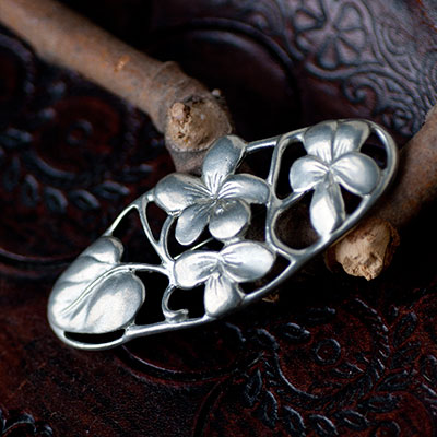 スミレでしょうか。可憐な野の花が三つと葉っぱが一枚、オープンワークで描き出されたヴィンテージ・ブローチ。マットなピューター(錫)のような質感で、落ち着きがあって素敵です。