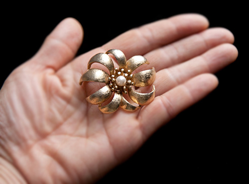 ランダムでアシンメトリーなシェイプの花びらが、くるくると思い思いにカールしている抽象的なフラワー・モチーフのヴィンテージ・ブローチ。