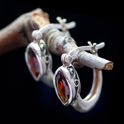 正面から見た時にはヴィンテージワインのような褐色がっかったワインレッドのカットガラスが、横から見たときには1mmほどの小さな同色のカットガラスとオープンワークの蔓模様がデザインのポイントになっているヴィンテージ・ピアスです。